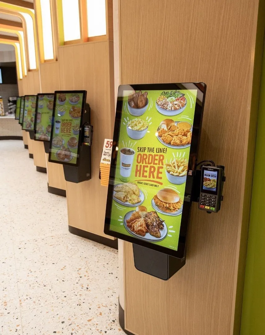 在这家新餐厅,Pollo Campero引入了六台Elo Wallaby™ Pro自助点餐设备,巧妙地安装在墙面上,成为餐厅设计的一部分。倾斜墙面设计让它们在空间中呈现出一排美丽的线条,顾客一进餐厅便能看到这一现代感十足的科技设备,视觉效果非常震撼。Elo Wallaby™ Pro的外观简洁大方,与Pollo Campero餐厅整体氛围完美融合,既提升了餐厅的现代感,又突显了品牌的创新精神。还能帮助顾客免去排队等待的烦恼,更快速、便捷地完成点餐。